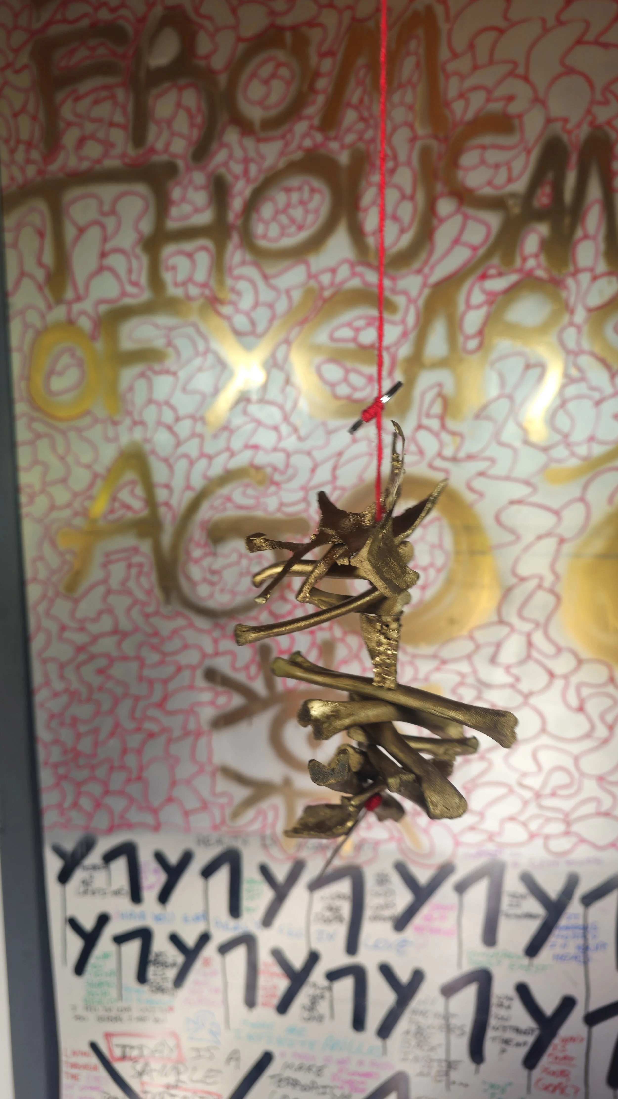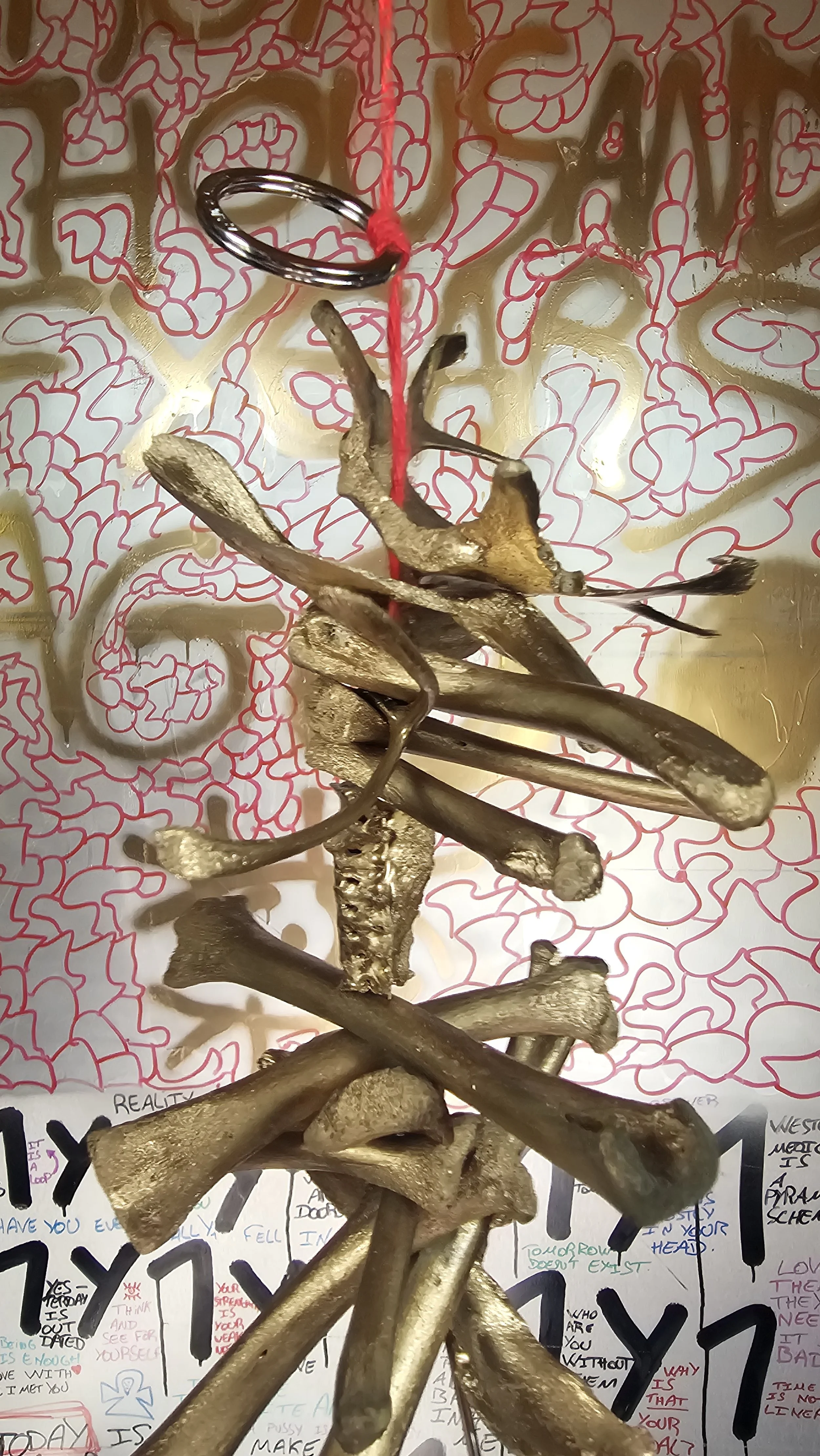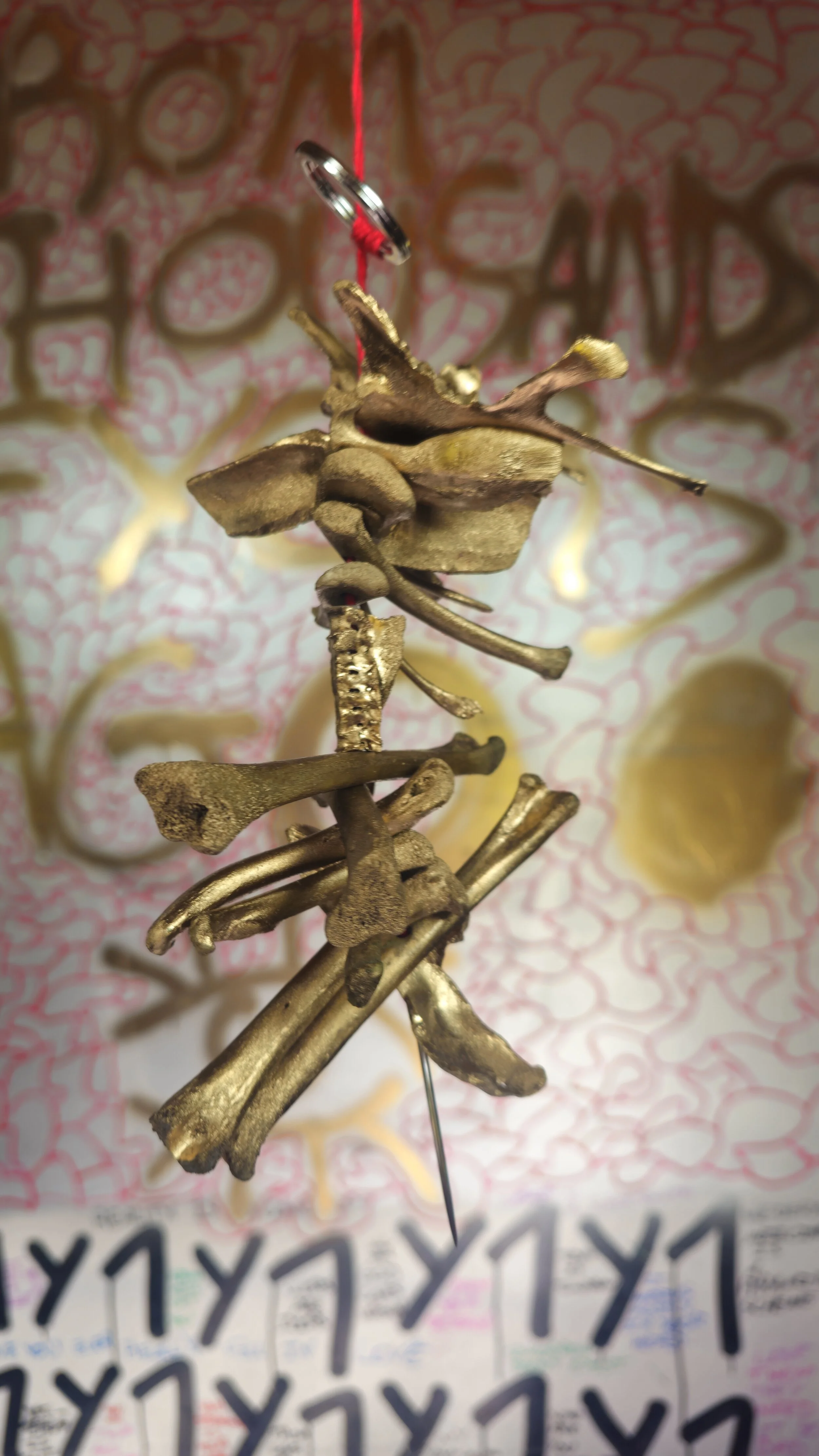 “Dead bird bones, Paint, Thread, Needle”